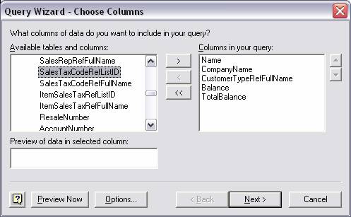 The following screen reflects the applied criteria to the query and the resulting QuickBooks recordset: