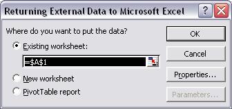 Select File / Return Data to Microsoft Excel, the following screen will prompt you for the destination of the data: